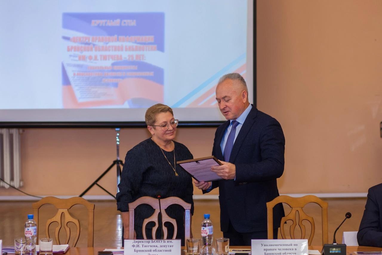 22.10.2024 Уполномоченный по правам человека в Брянской области принял участие в круглом столе, посвященном 25-летию Публичного центра правовой информации Брянской областной научной библиотеки им. Ф. И. Тютчева.